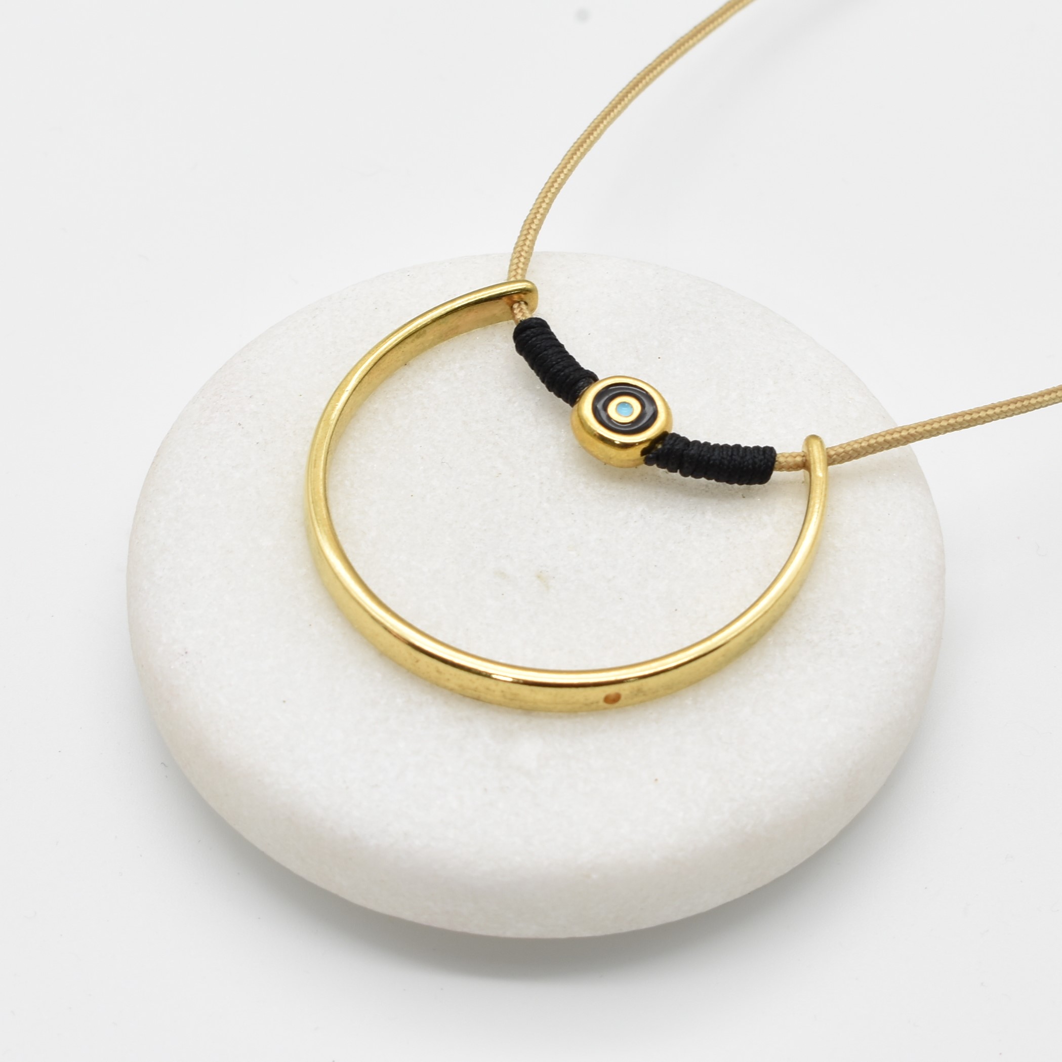 Χειροποίητο κολιέ από κράμα χωρίς νικέλιο, επικαλυμμένο με χρυσό και λεπτομέρειες ζωγραφισμένες με το χέρι από σμάλτο και μακραμέ. Διατίθεται σε 5 χρώματα.