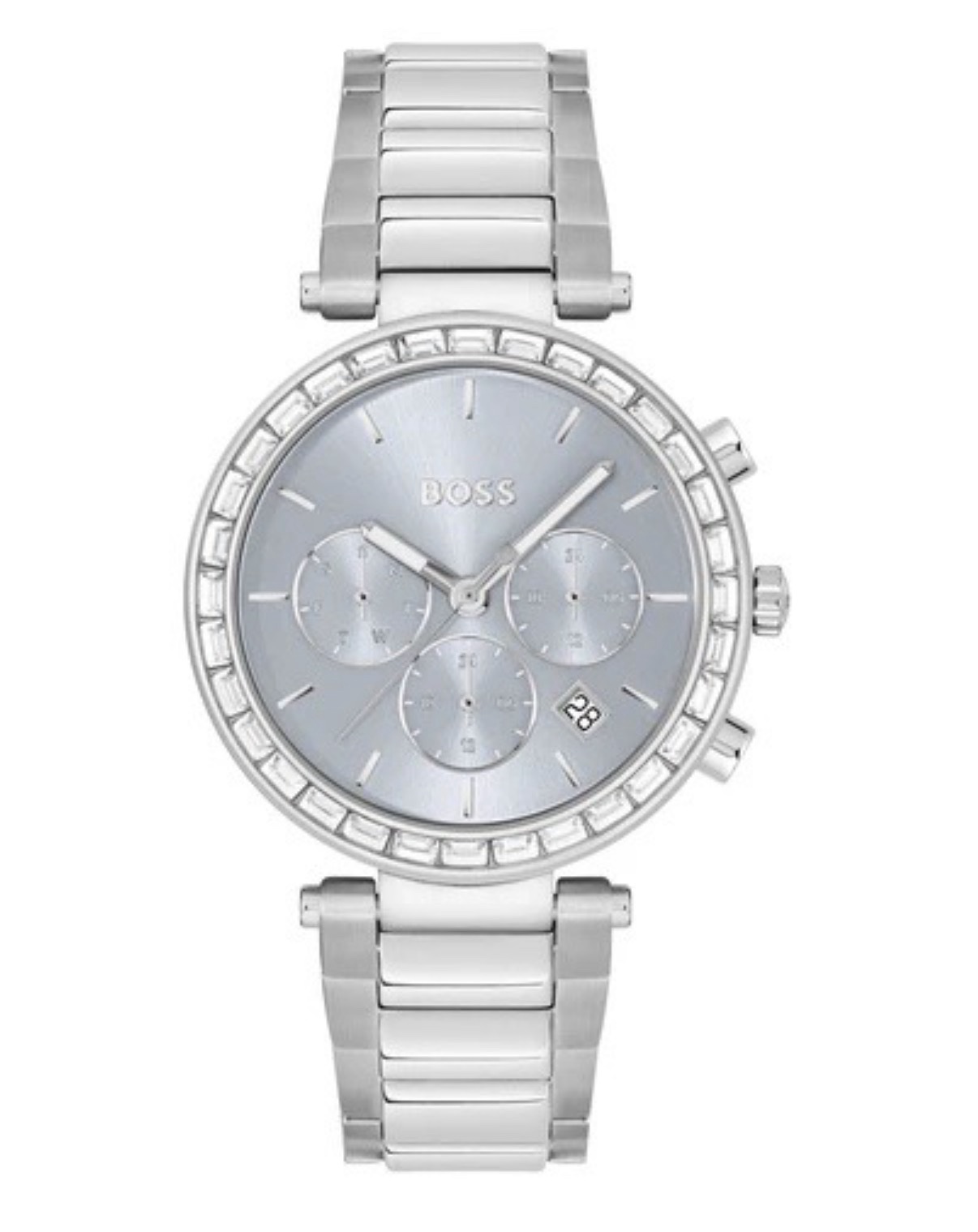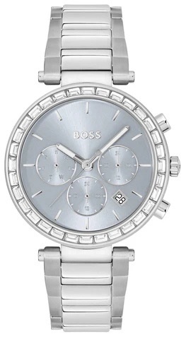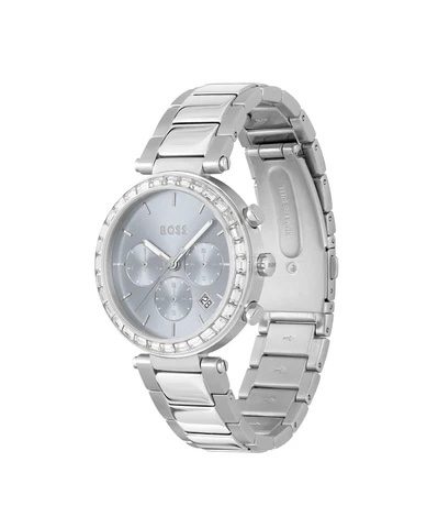 The BOSS Andra 1502692 is designed like a piece of jewellery, with a refined crystal bezel framing a luminous ice-blue/silver dial. The three sub-dials add just the right amount of texture, while the stainless-steel bracelet keeps the feel polished and effortless, from morning coffee to вечер dinner plans.