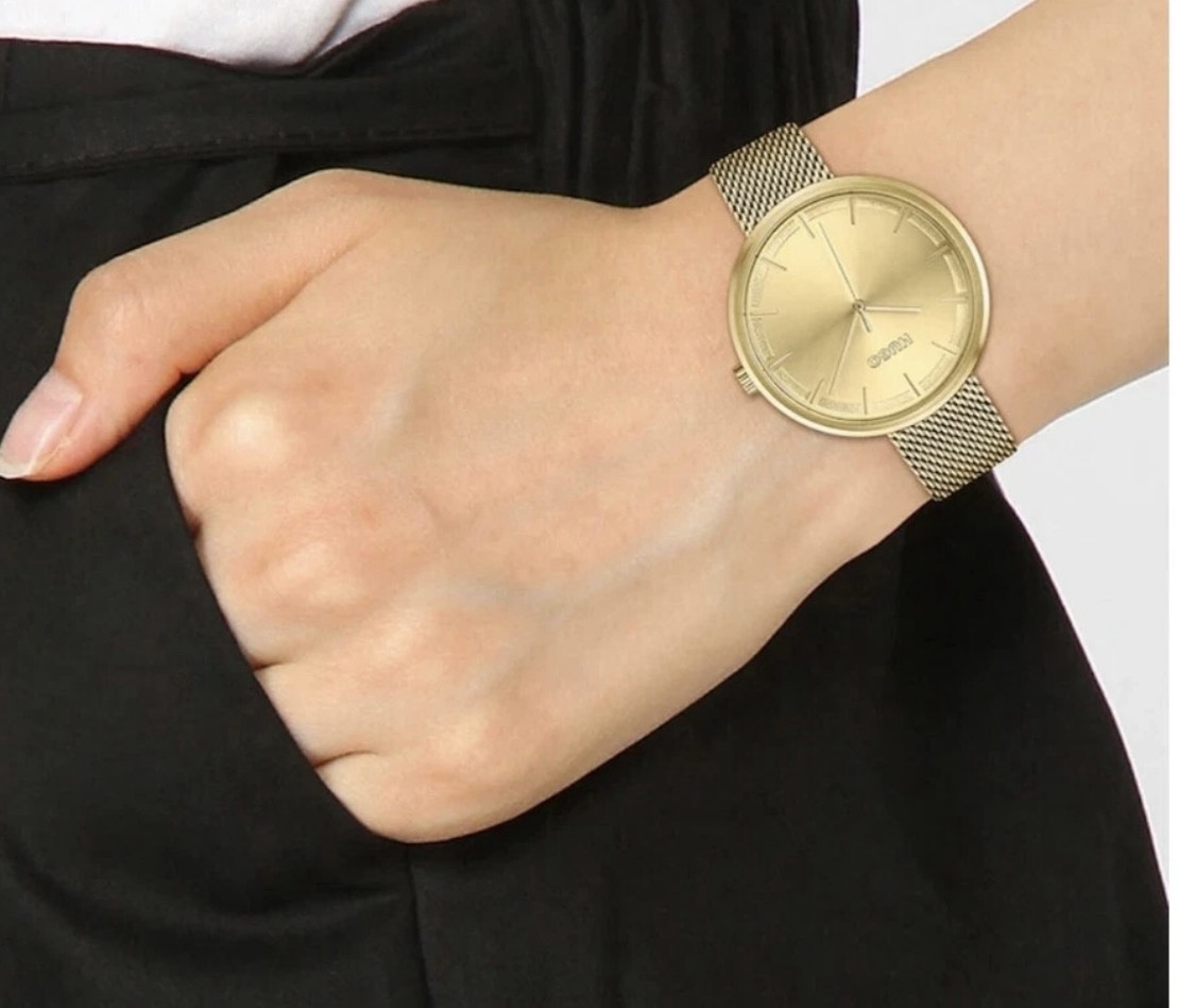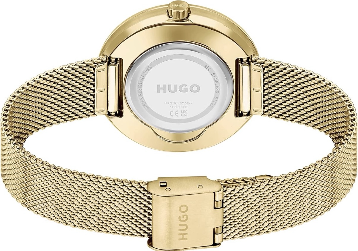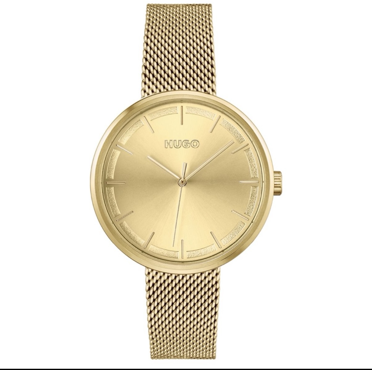 The slim gold-tone stainless steel case is paired with an elegant mesh bracelet, offering a lightweight feel and comfortable all-day wear. Minimalist hands and the bold HUGO logo complete the contemporary design, creating a watch that feels effortless yet distinctive.