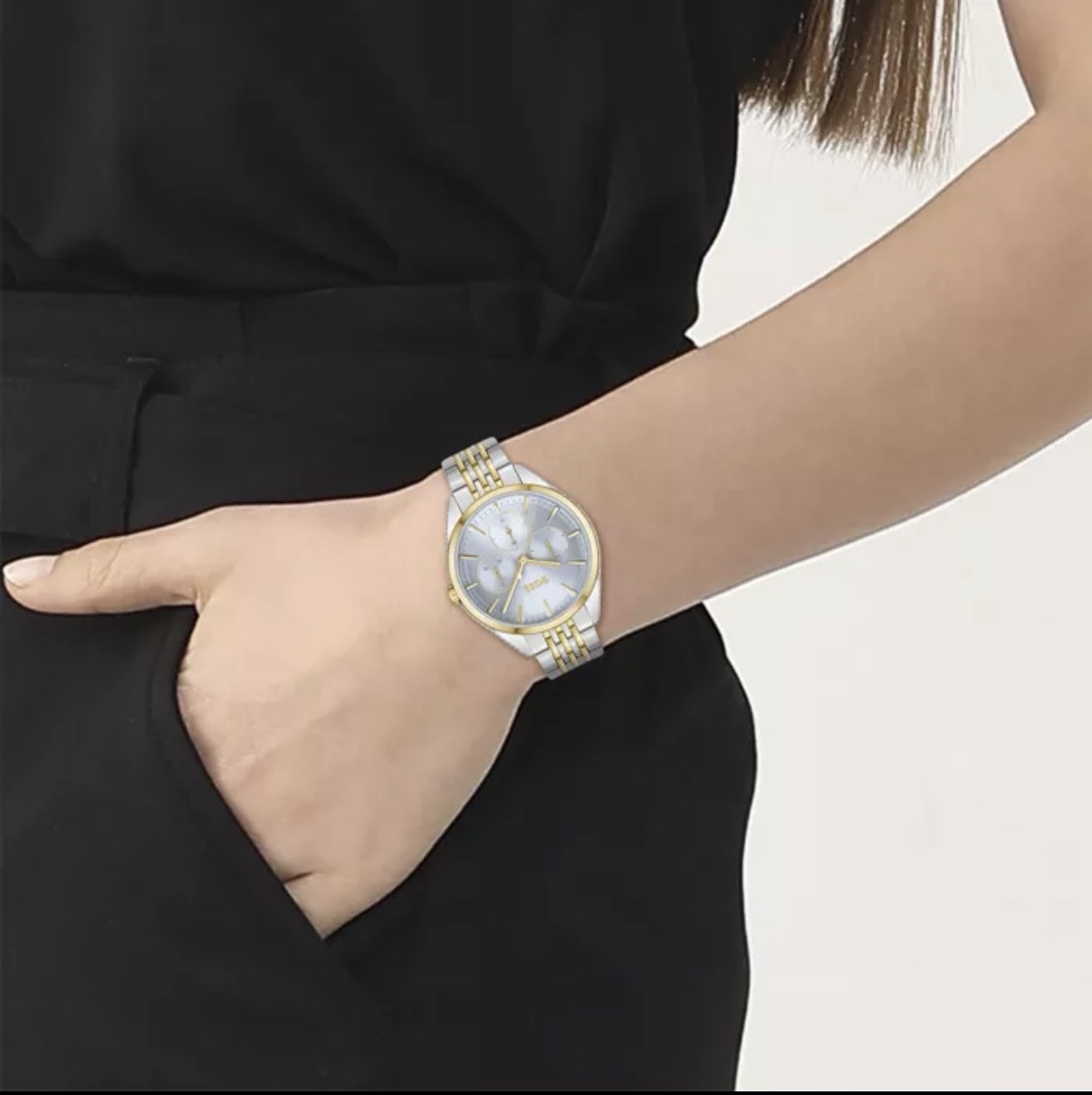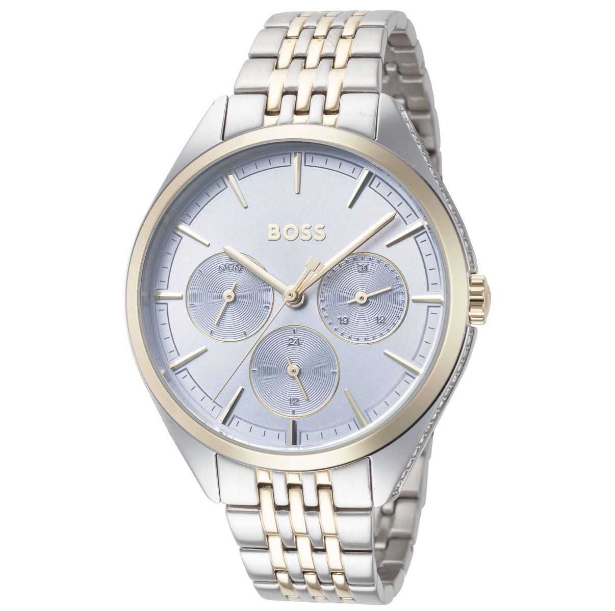 The Boss 1502702 women’s watch is a refined multifunction timepiece that blends classic elegance with modern functionality. Designed for women who appreciate sophisticated details, this Hugo Boss model features a beautifully balanced silver sunray dial enhanced by gold-tone accents for a timeless, luxurious look.