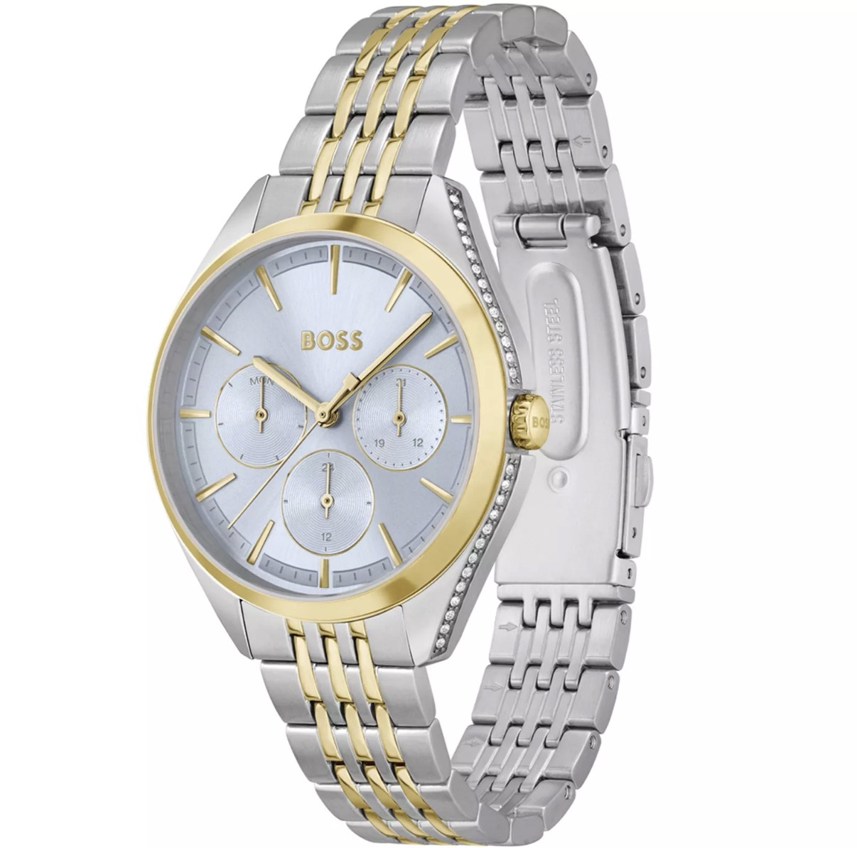 Crafted with a stainless steel case and an elegant two-tone bracelet in silver and gold tones, the Boss 1502702 offers durability and comfortable all-day wear. Powered by a precise quartz movement and protected by mineral crystal glass, it is water-resistant to 30 metres (3 ATM), suitable for everyday splashes.