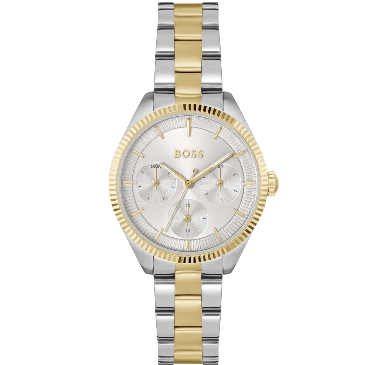 The two-tone stainless steel bracelet blends silver and gold tones for versatile styling, while the fluted gold-tone bezel adds a subtle touch of sophistication. Powered by a precise quartz movement and protected by mineral crystal glass, this watch is ideal for everyday wear with a polished finish.