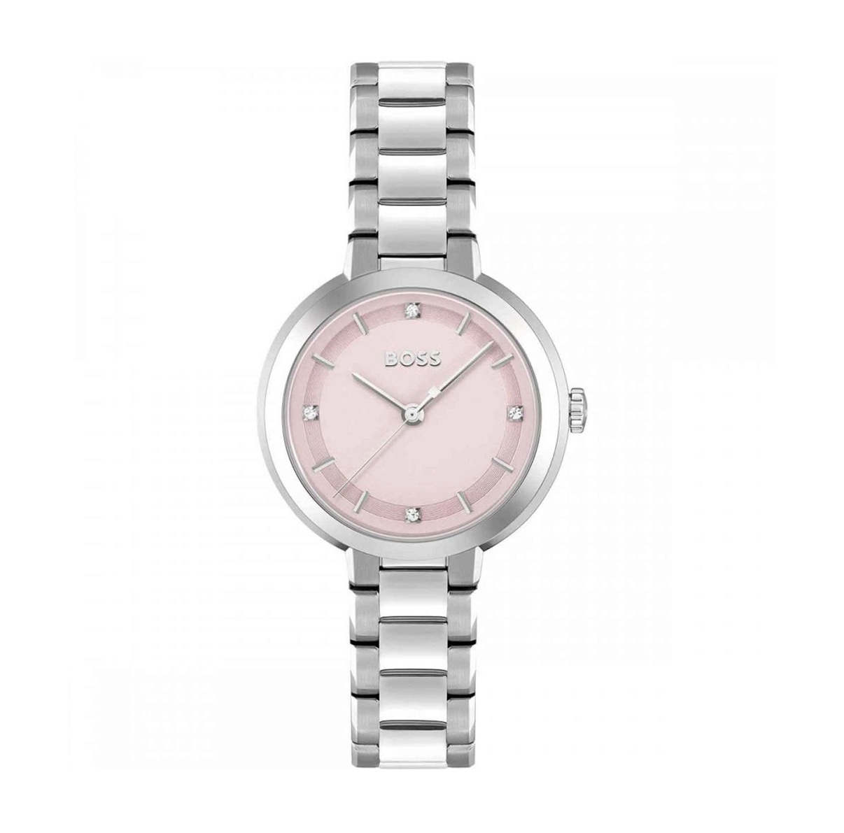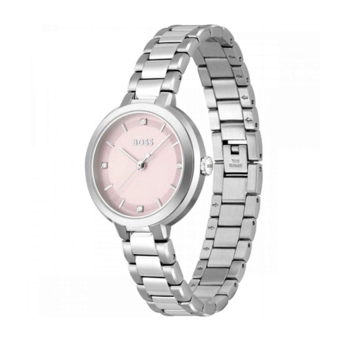Elegant and delicately feminine, the Boss 1502757 features a soft baby pink dial that adds a refined touch of color to a timeless design. Subtle crystal hour markers provide gentle sparkle, while the polished stainless steel case and bracelet offer a clean, modern finish.