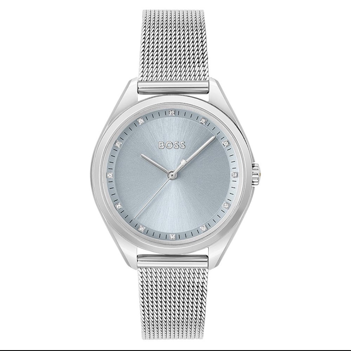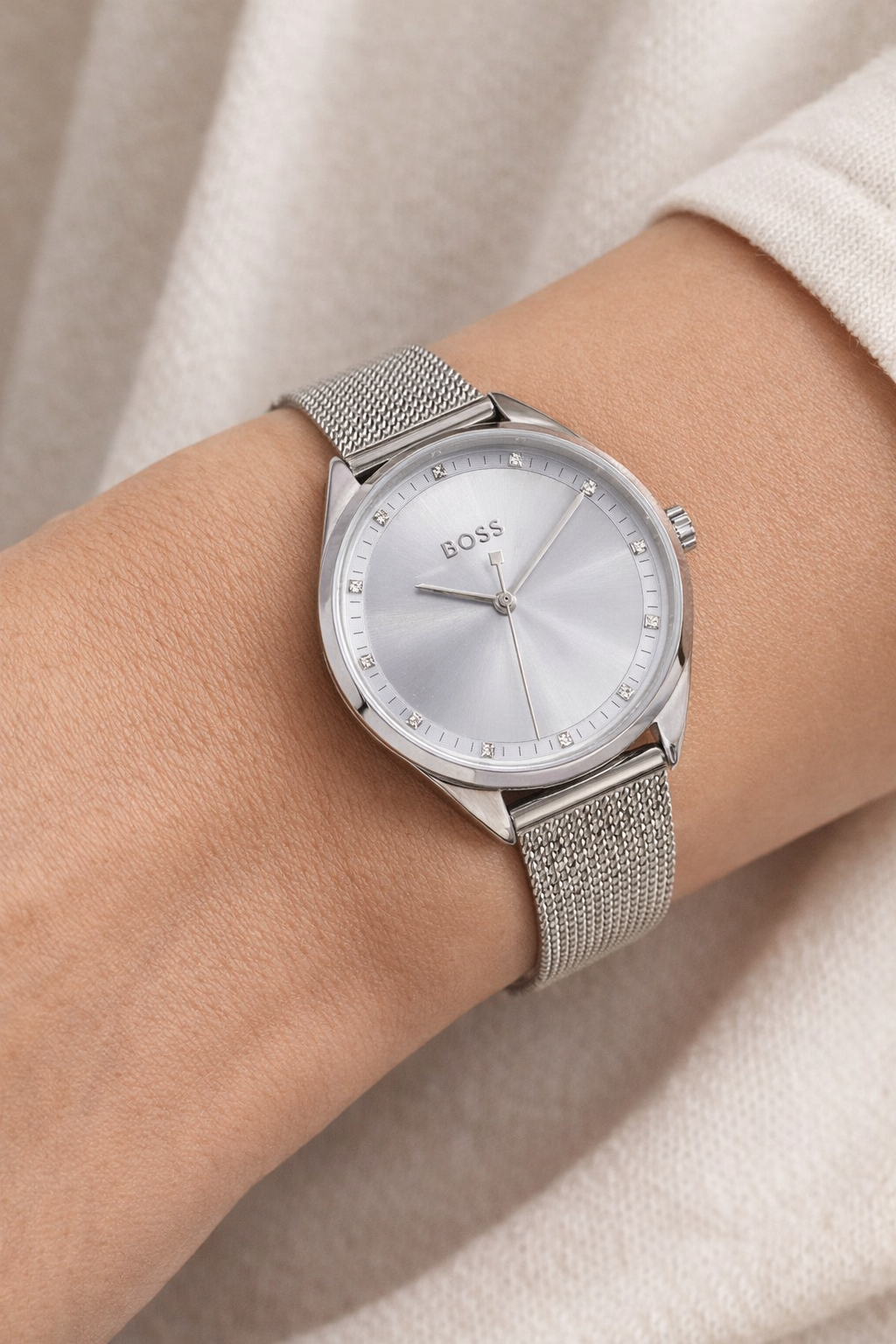 Elegant and effortlessly modern, the Boss 1502667 is a refined women’s watch designed for everyday sophistication. Featuring a silver sunray dial accented with delicate crystal hour markers, it reflects light with subtle brilliance. The polished stainless steel case is paired with a sleek mesh bracelet, offering a comfortable fit and a timeless, minimalist aesthetic.