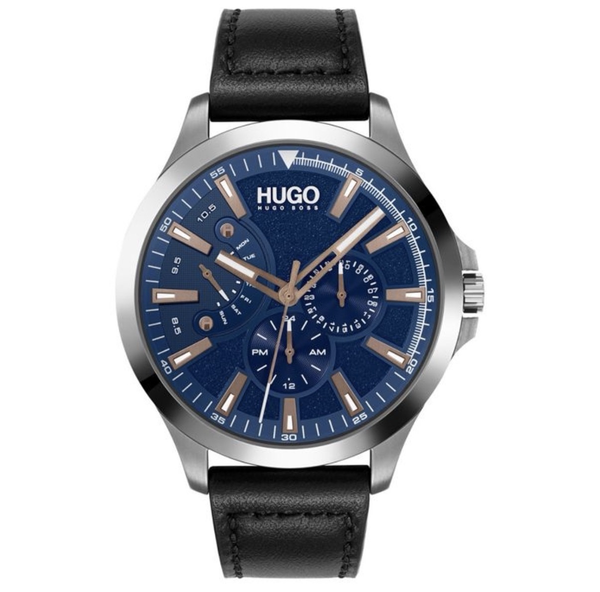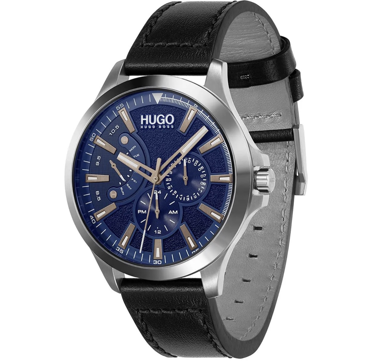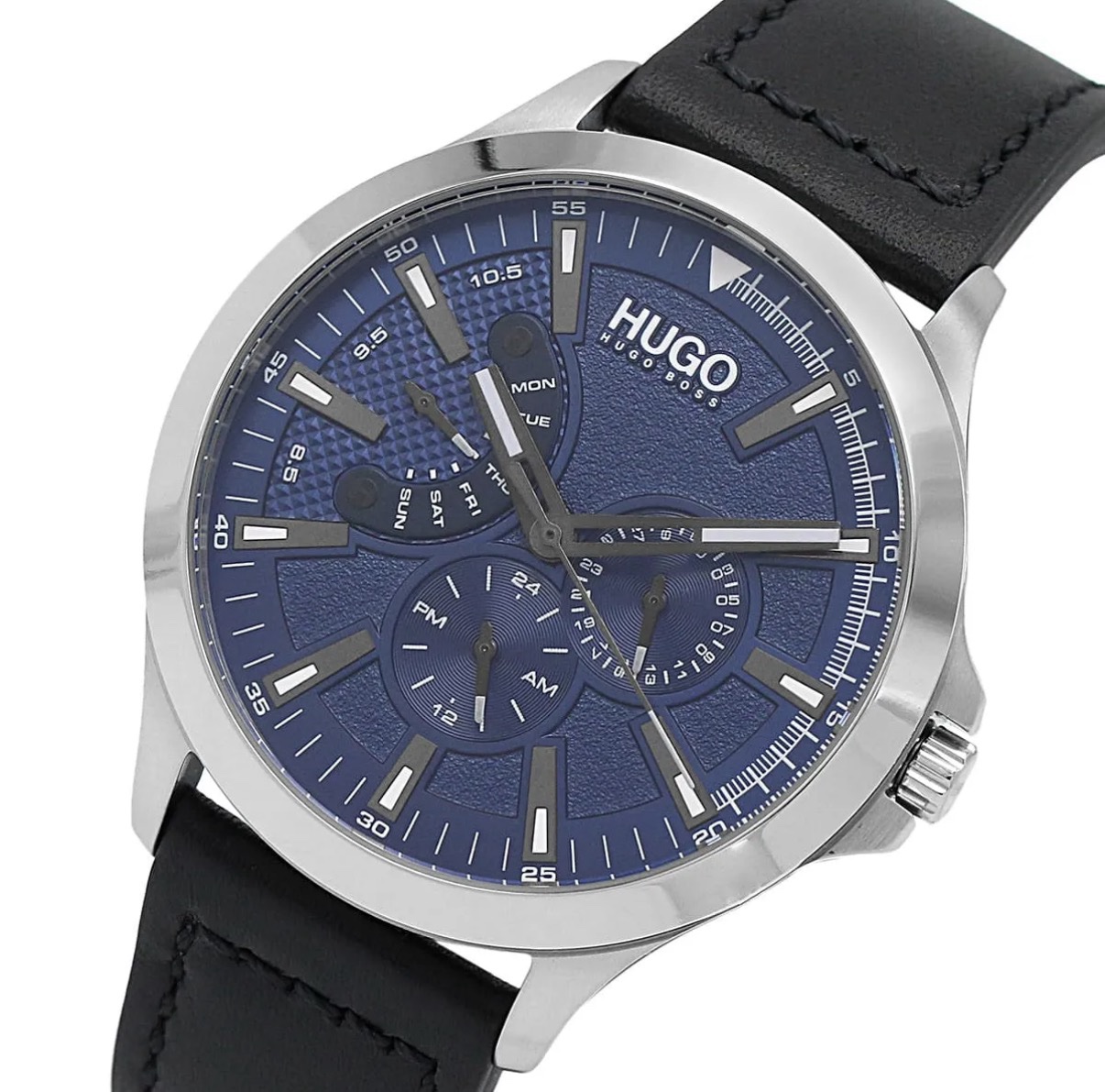 The HUGO Leap 1530172 mixes sharp, modern lines with a rich deep-blue textured dial that catches the light like brushed velvet. Silver-tone hands and markers keep it crisp and legible, while the multifunction subdials add practical everyday utility without cluttering the design. It’s a confident “day-to-night” piece, sporty enough for daily wear and clean enough for smart looks.